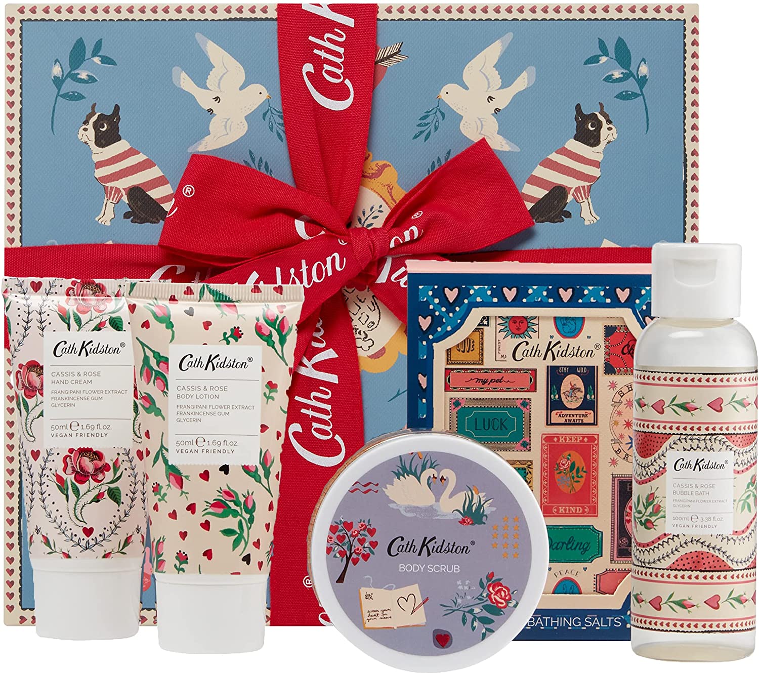 This pampering, Cath Kidston beauty set makes a heart-warming gift. Tucked inside an enchanting Keep Kind print box are five Cassis & Rose scented bath and body treats. The vegan friendly formulations are blended with extracts of frangipani and frankincense. Finished with a red Cath Kidston bow.